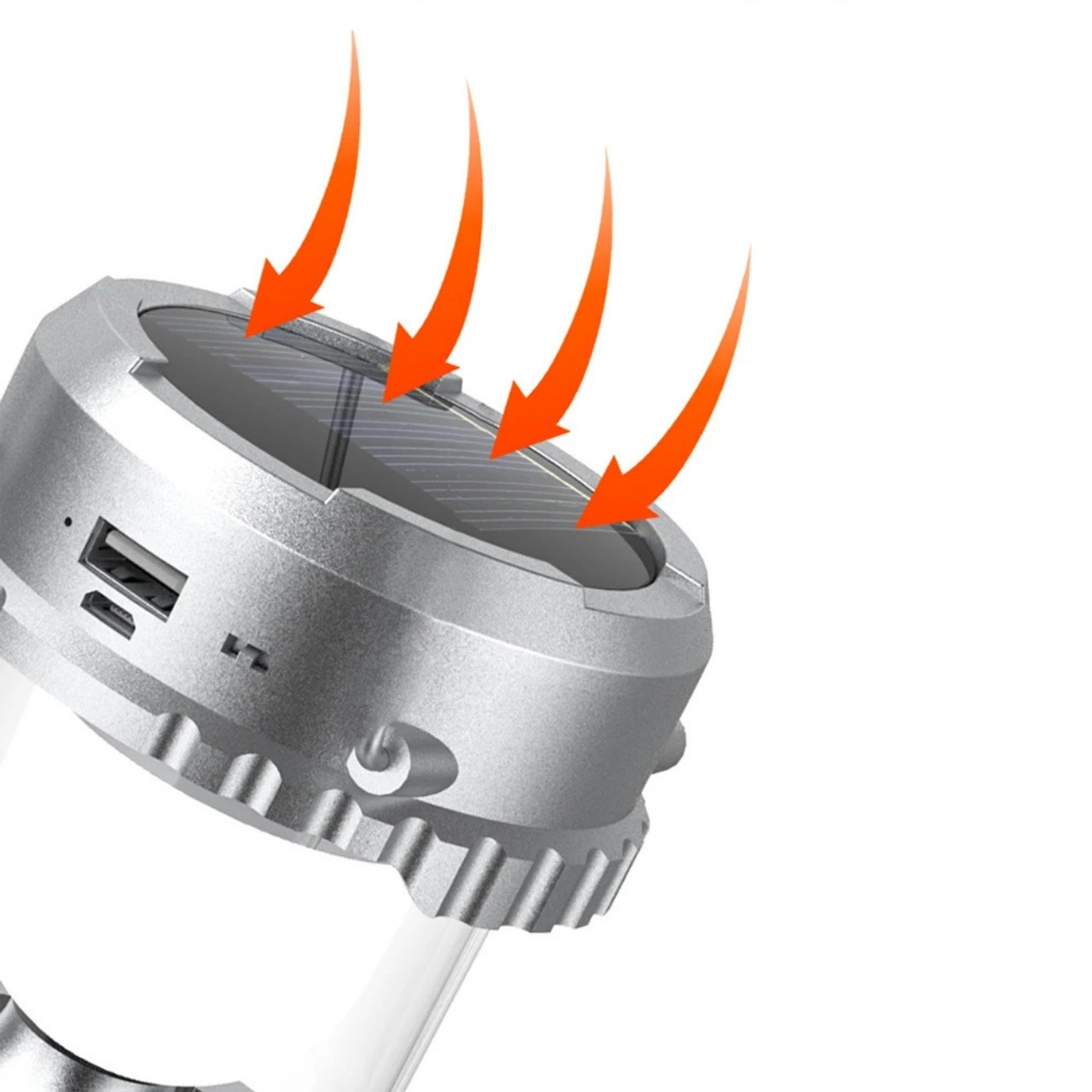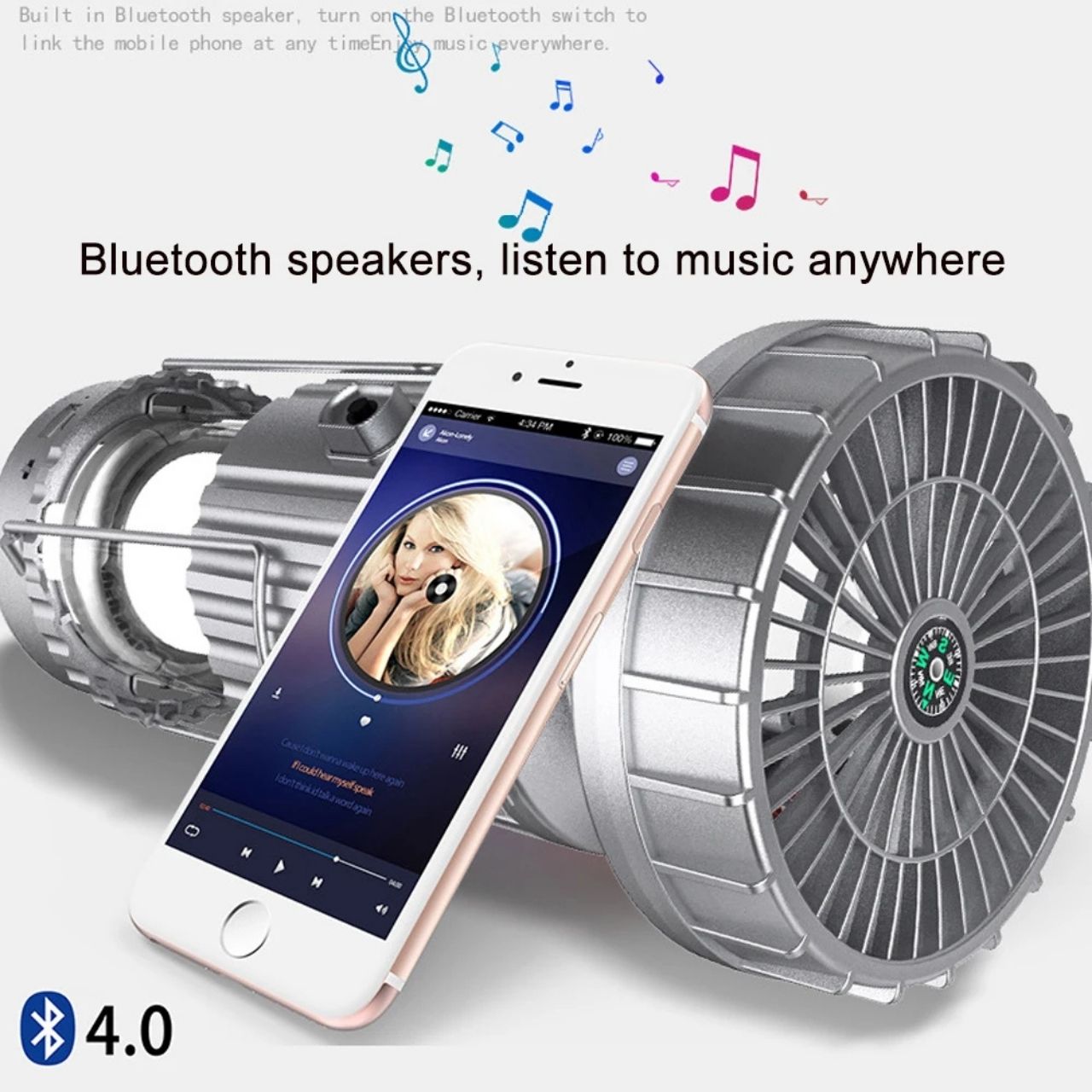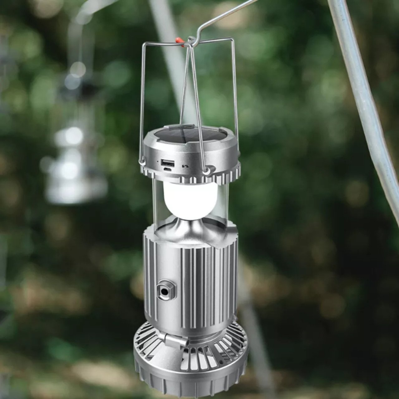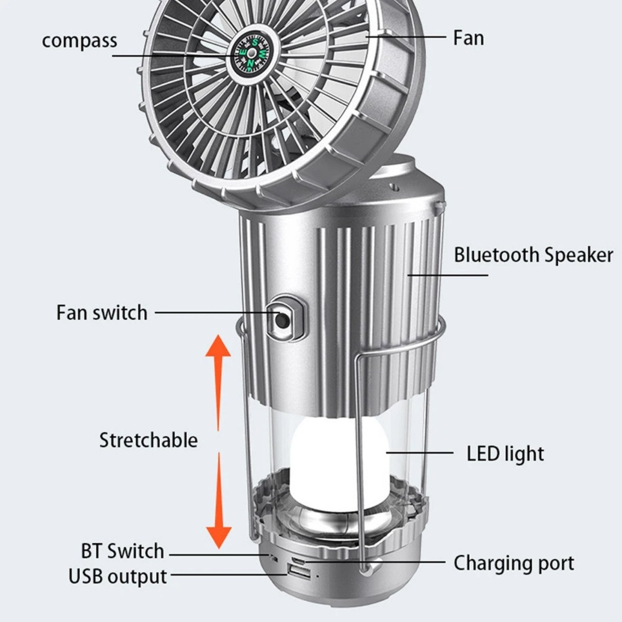 Ideāls risinājums kempingam, ceļojumiem un ārkārtas situācijām – apvienojot 5 ierīces vienā! Šī daudzpusīgā ierīce apvieno ventilatora, lukturīša, skaļruņa, powerbank akumulatora un pat kompass funkcijas. Ar iespēju uzlādēt caur USB vai saules gaismu, tā nekad jūs nepievils. Tā ir ideāli piemērota lietošanai mājās, ceļā, kempingā vai elektroenerģijas padeves pārtraukumu laikā.