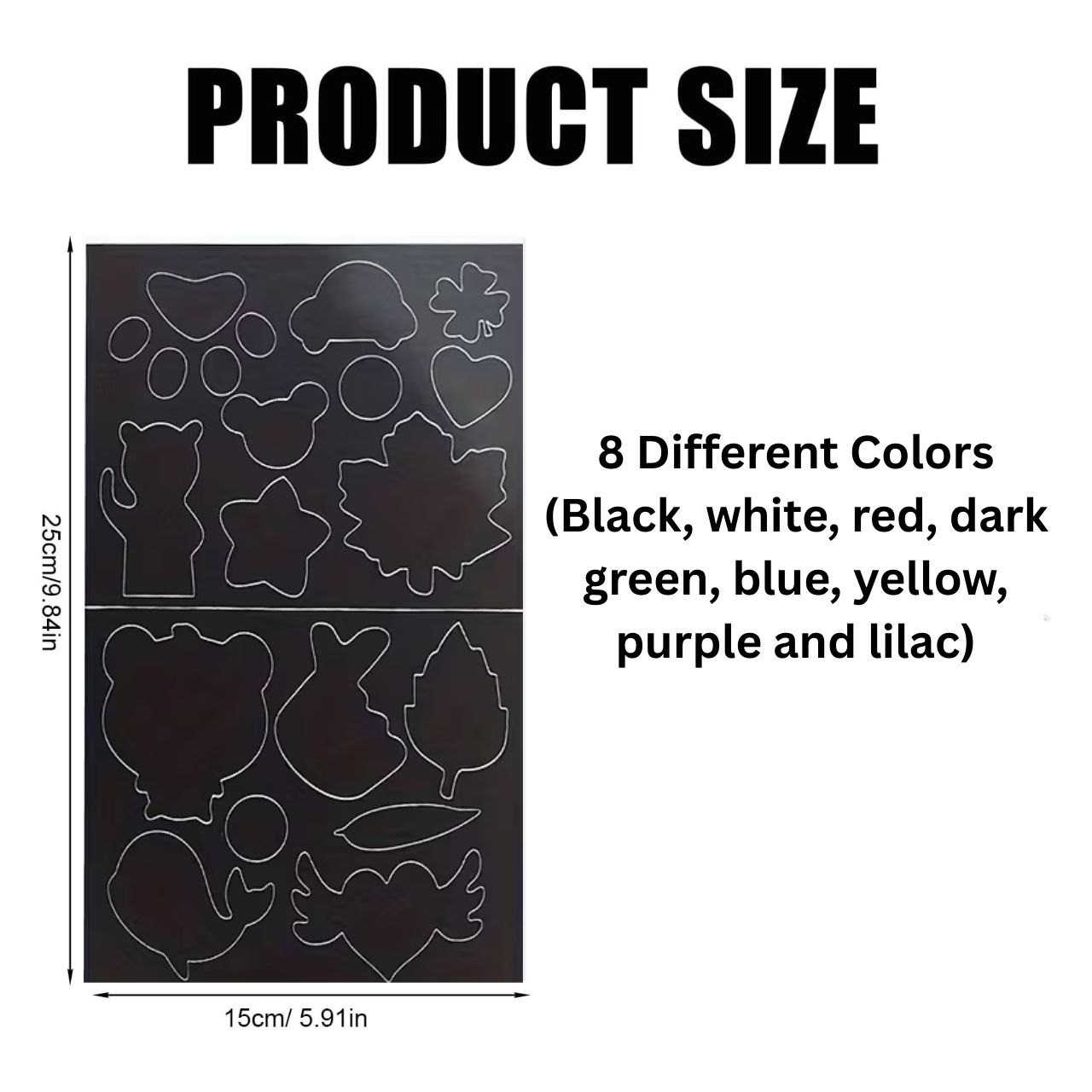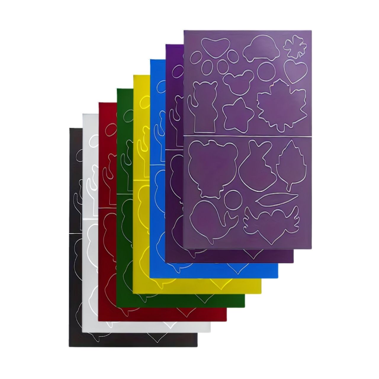 Melna, balta, sarkana, tumši zaļa, zila, dzeltena, violeta un ceriņkrāsa