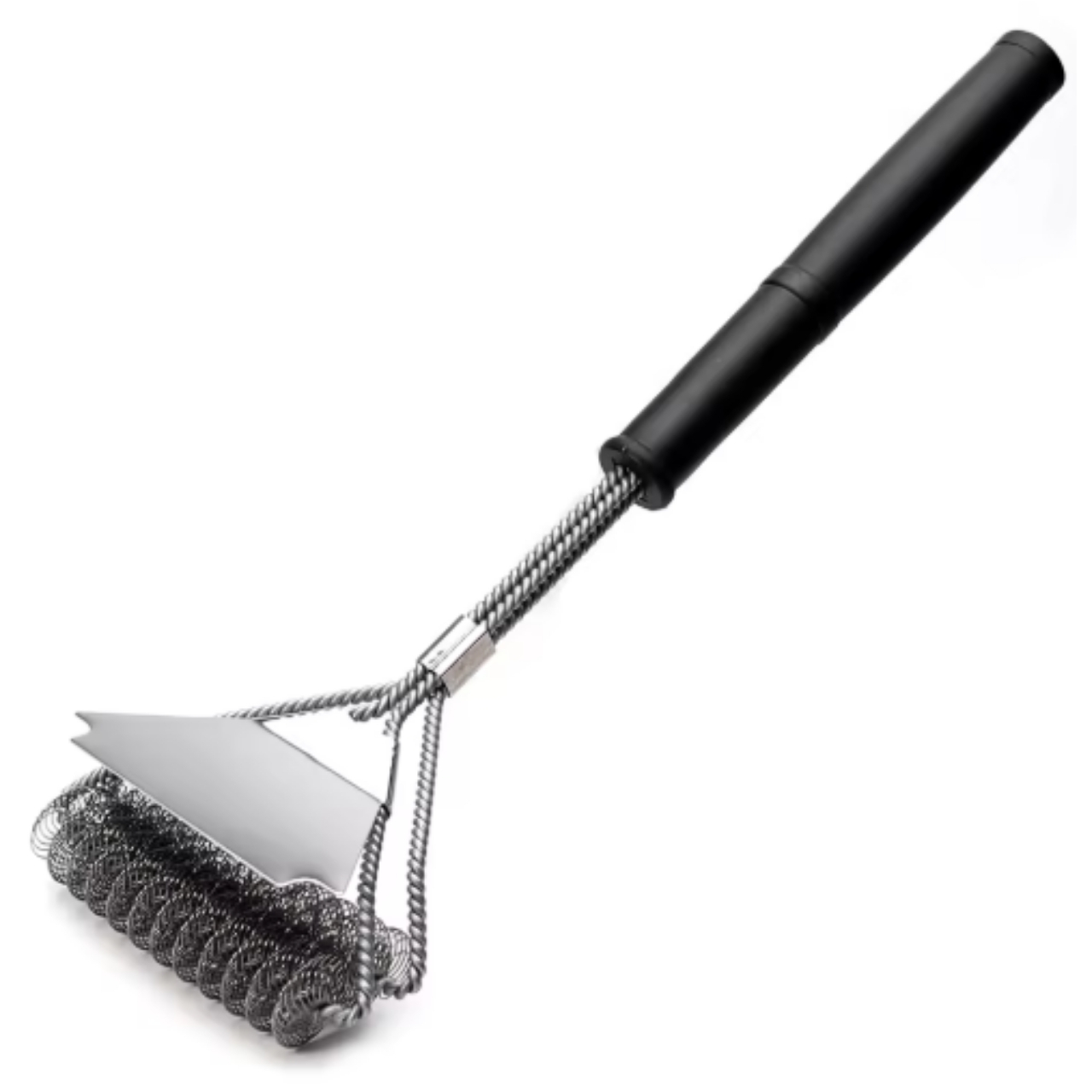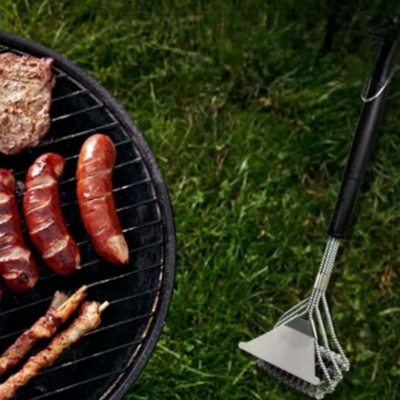 Aizmirstiet vecās birstes ar bīstamiem metāla sariem - šis nerūsējošā tērauda modelis ir pilnīgi bez sariem, bet joprojām rūpīgi tīra restes. Pateicoties platam un stabilam skrāpim, jūs tīrīsiet grila virsmu daudz ātrāk nekā ar parastiem šauriem uzgaļiem.