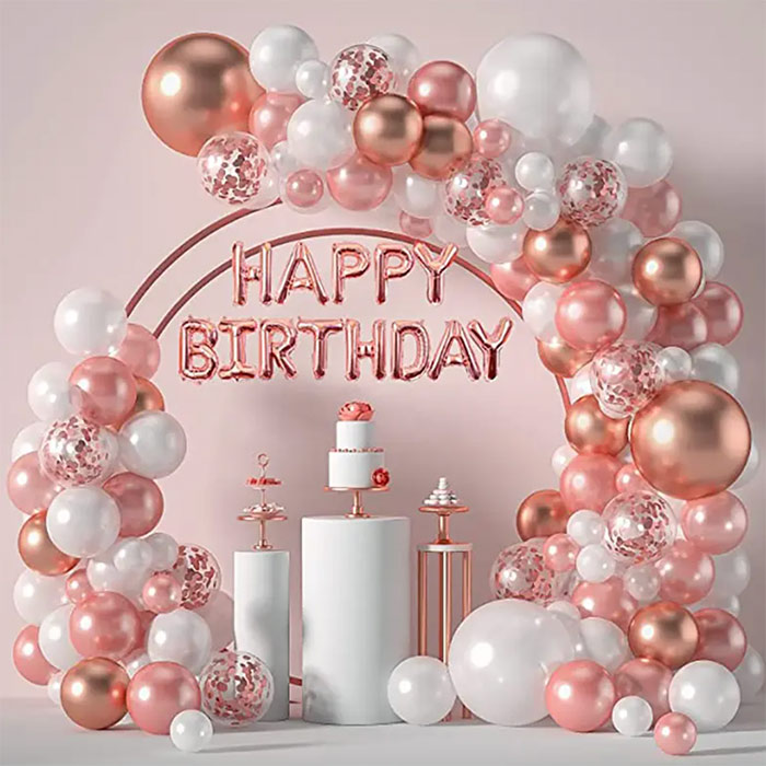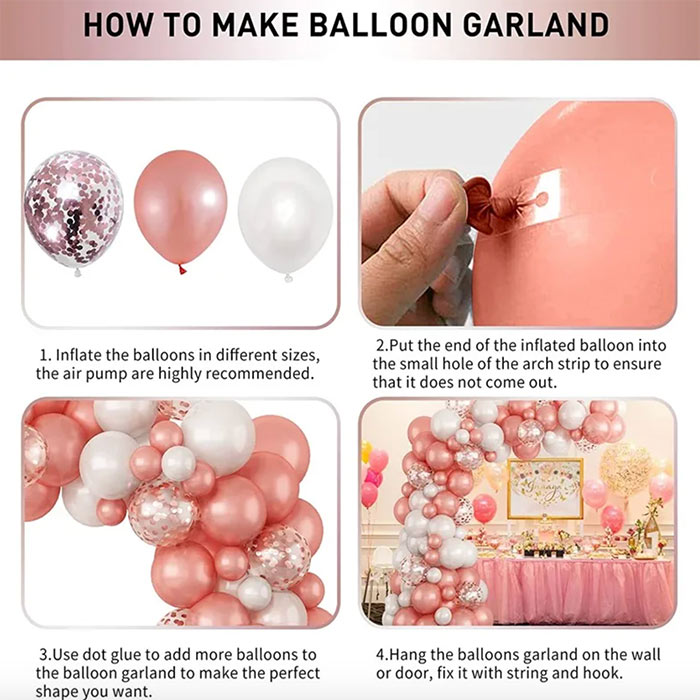 Jūs saņemat dažādu izmēru un nokrāsu balonus un visus rīkus to uzstādīšanai!