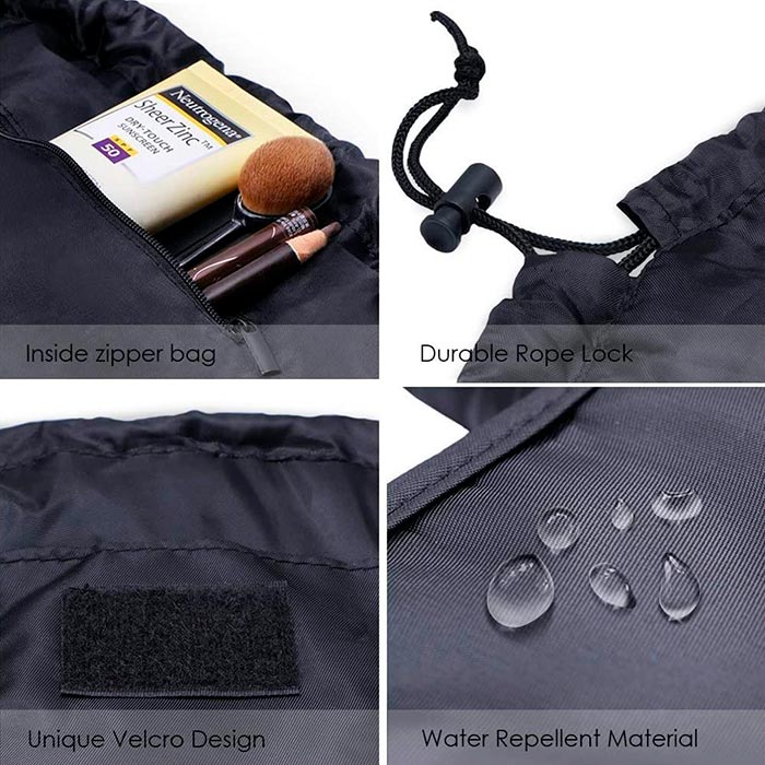 • Piemērota ikdienas lietošanai un ceļošanai. Izstiepiet somu, novietojiet tajā savas lietas un aizvilkiet aizvilkšanas virvi, lai aizvērtu somu.