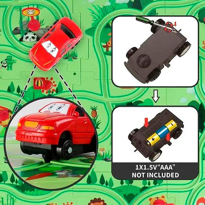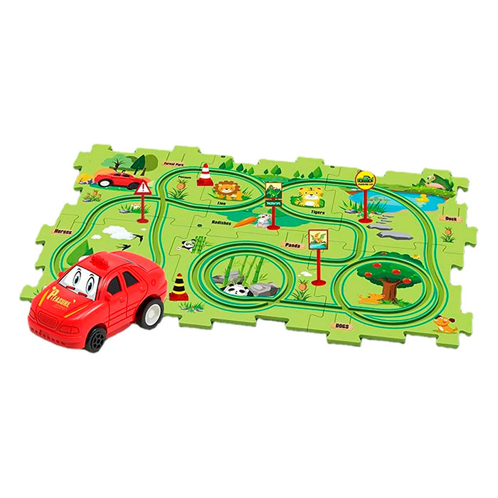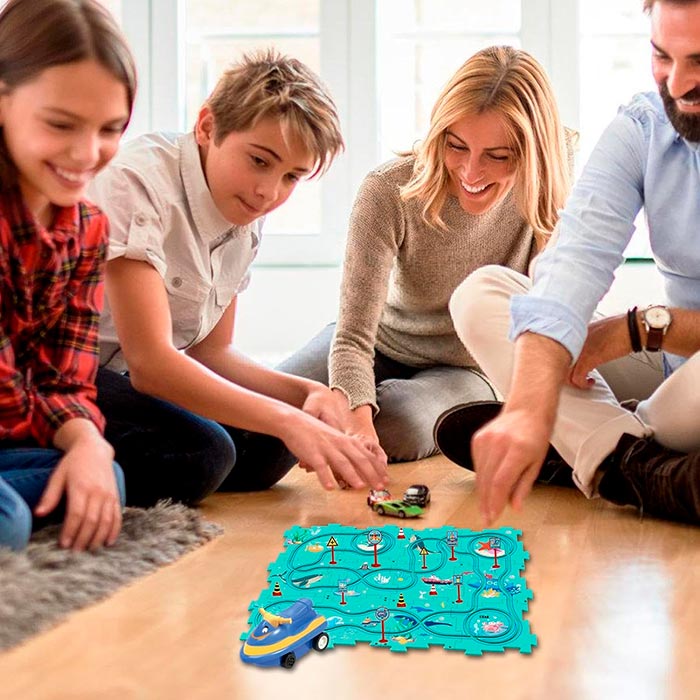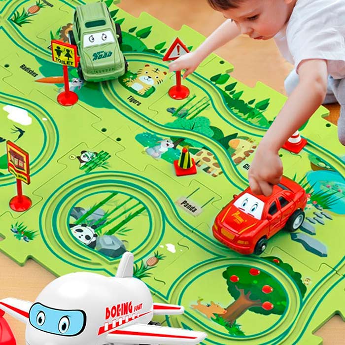 Iekštelpu spēle, izglītojoša aktivitāte. Uzbūvējiet paklāju pēc savas gaumes un brauciet pa dzelzceļa sliedēm iedomātā pasaulē.