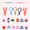 Novietojiet elastīgo lenti uz ierīces tā, lai tā būtu krustota vidū. Novietojiet vēl 2 gumijas lentes līdzīgā veidā. Noņemiet apakšējo elastīgo lenti ar izliektu aksesuāru no labās puses, aptverot divas elastīgās lentes vidū. Dariet to pašu kreisajā pusē. Uzlieciet jaunas elastīgās lentes un turpiniet procedūru. Beigās savienojiet kreiso un labo elastīgo lenti kopā. Brīdinājums: Sakarā ar sīkajām daļiņām, šis produkts nav piemērots bērniem līdz 3 gadu vecumam.