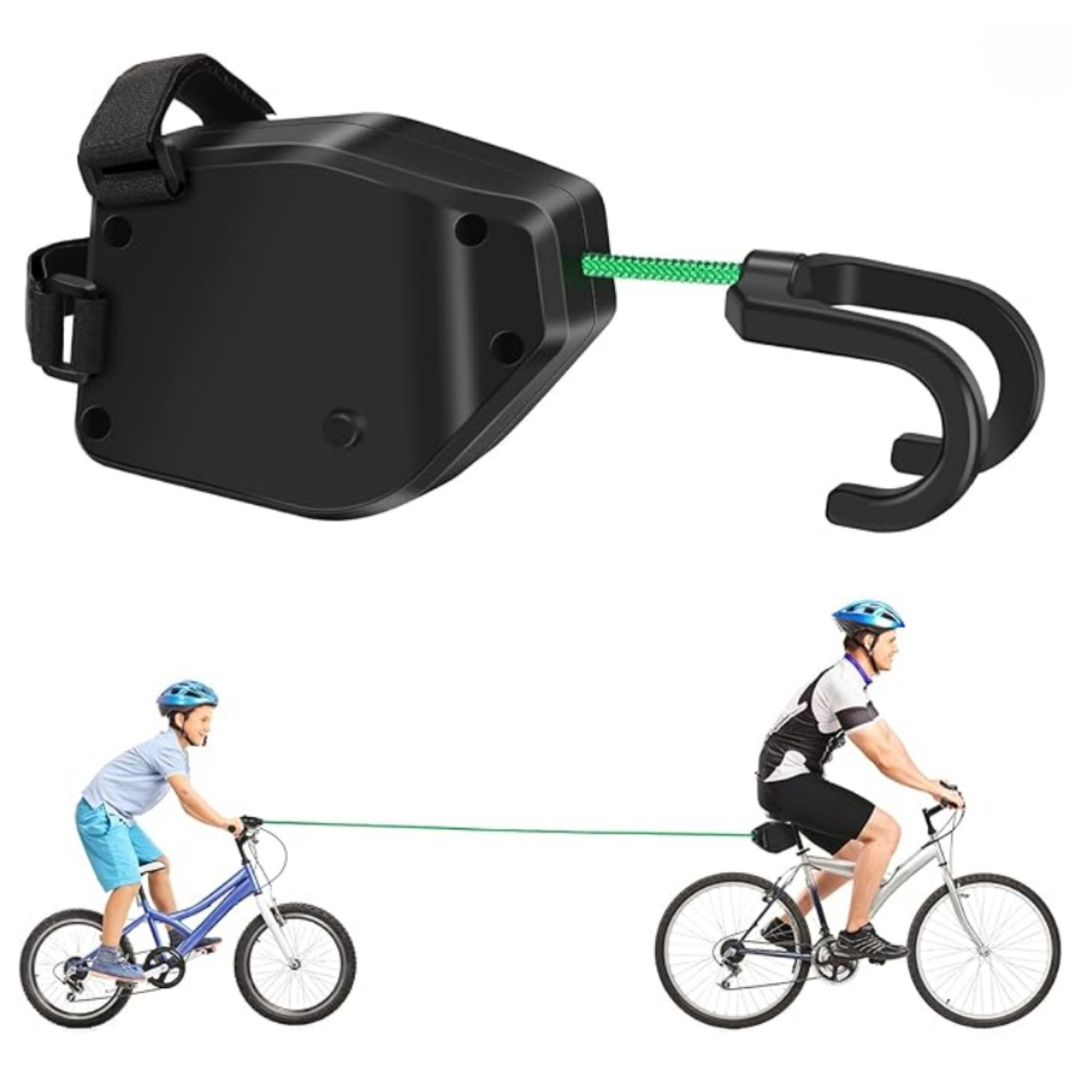 Piemērota bērna (vai cita) velosipēda vilkšanai ar vecāku, braucot. Lai lietotu elastīgo velosipēda vilkšanas virvi (2,5 m), vispirms sagatavojiet gan bērna, gan pieaugušā velosipēdu un pārbaudiet to darbību. Pievienojiet vienu galu virvei zem sēdekļa pieaugušā velosipēdā, bet otru galu pie bērna velosipēda stūres vai rāmja galvas. Virve jābūt nedaudz saspringtai, bet ne pārāk stingrai, lai nodrošinātu dabisku kustību bez trīcošām vibrācijām. Pārliecinieties, ka virve neskar ķēdi vai riteņus brauciena laikā. Pieaugušais brauc jēgpilni un bērns vienmēr tur stūres ar abām rokām un seko. Pēc brauciena noņemiet virvi, nosusiniet un glabājiet sausā vietā. Nelietojiet virvi, braucot lejup vai ātri, vienmēr valkājiet ķiveri un aizsargtērpus, tikai pieaugušais drīkst lietot virvi un pārbaudīt to pirms lietošanas. Produkts jālieto tikai pieaugušo uzraudzībā. Vienmēr pārbaudiet pareizu piestiprināšanu pirms lietošanas.