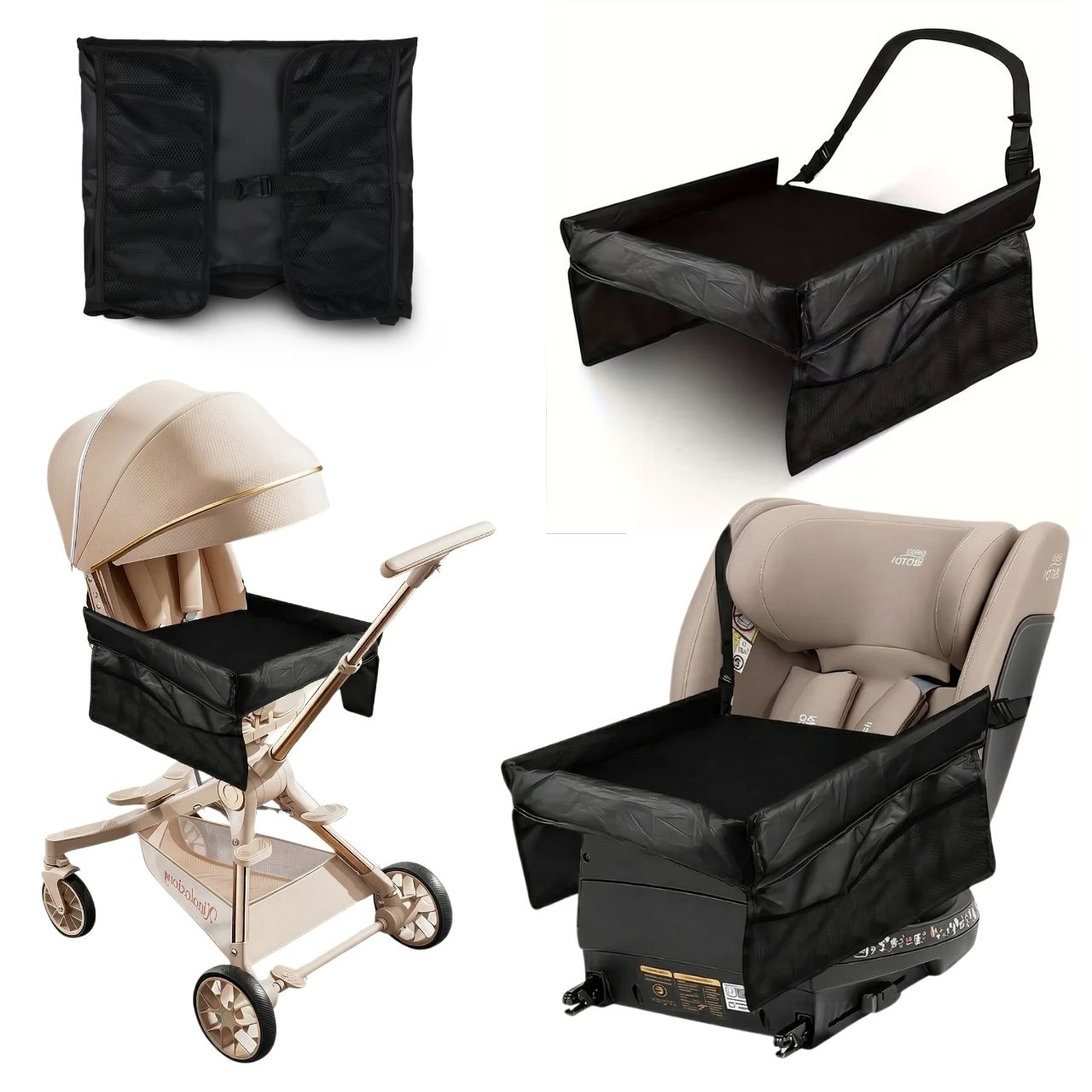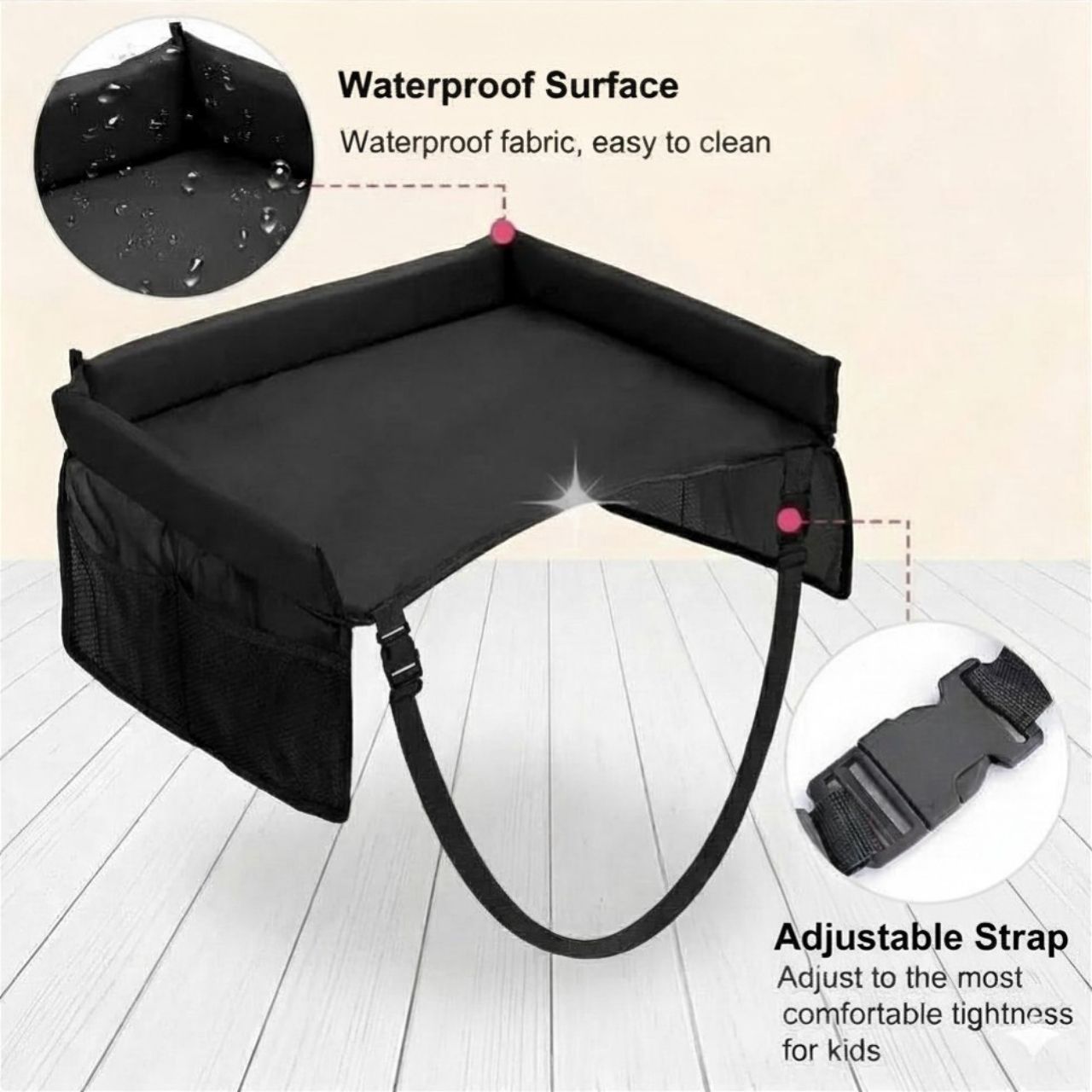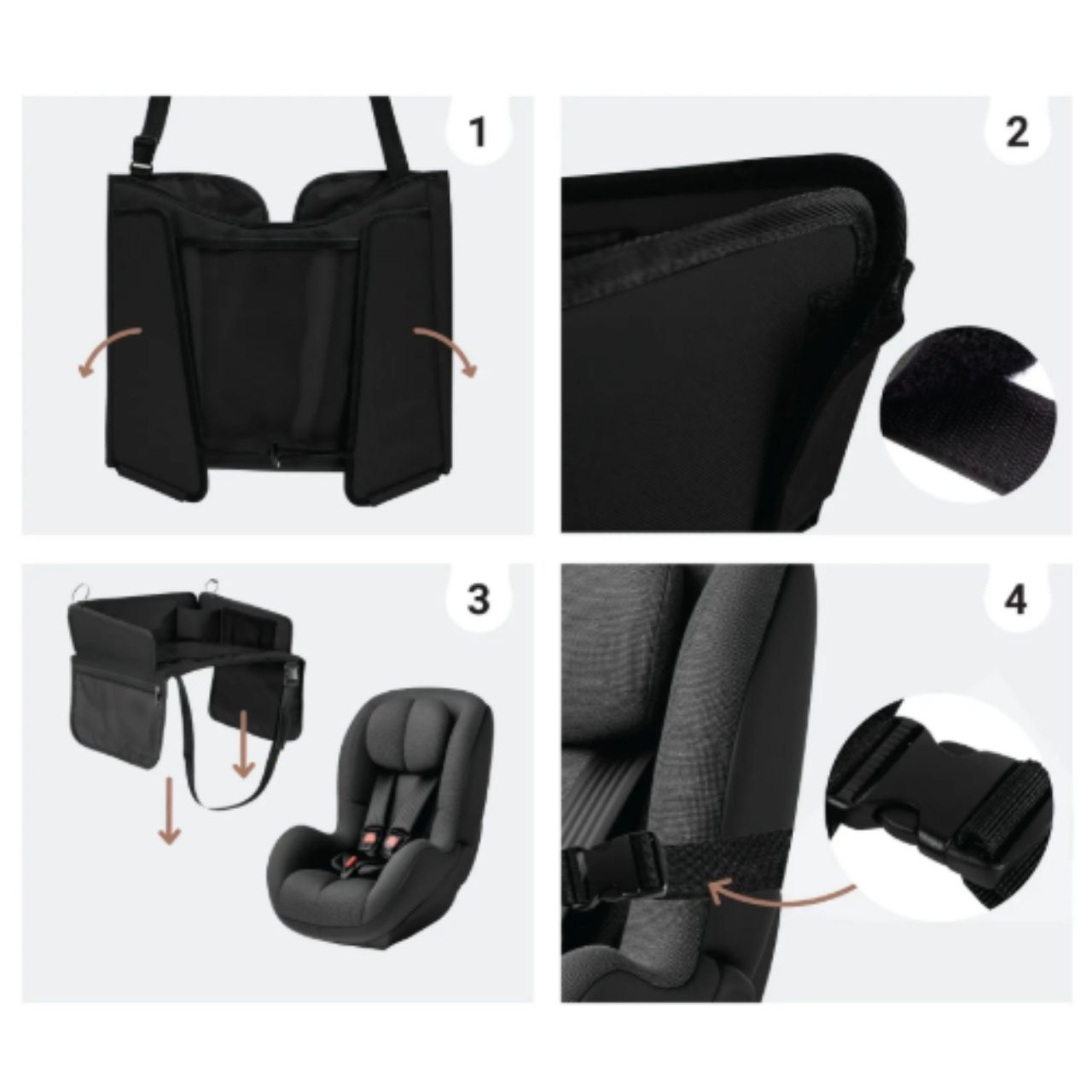 Ceļojumu galdiņam ir regulējamas siksnas ar sprādzēm. Vienkārši novietojiet siksnu ap sēdekli un nostipriniet to ar drošības sprādzi. Jūs varat arī pielāgot siksnu garumu.