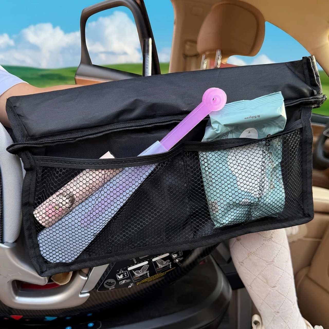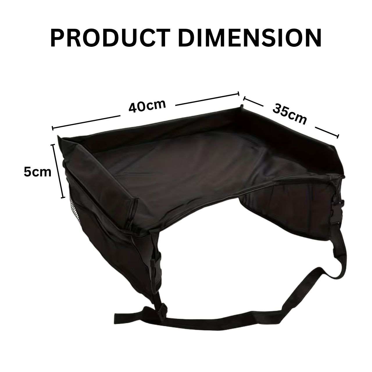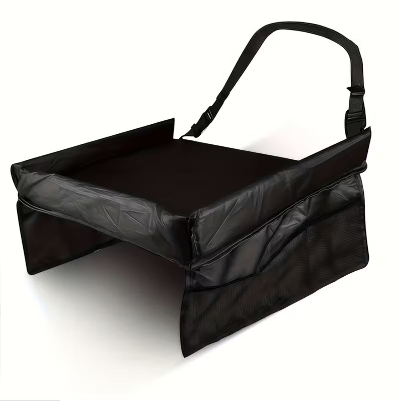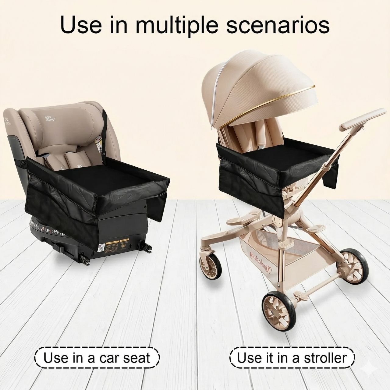 Ceļojumu galdiņam ir regulējamas siksnas ar sprādzēm. Vienkārši novietojiet siksnu ap sēdekli un nostipriniet to ar drošības sprādzi. Jūs varat arī pielāgot siksnu garumu.