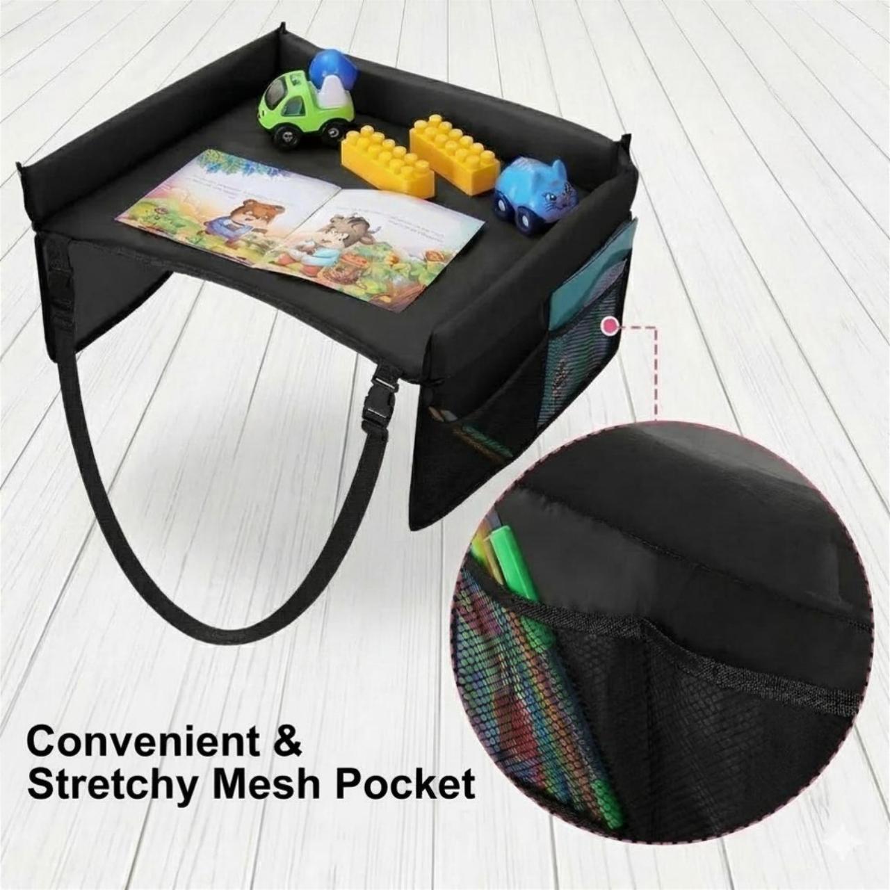 Ceļojumu galdiņam ir vairāki nodalījumi, kur bērni var ievietot savus zīmuļus (krāsainos zīmuļus, vaskas krītiņus, marķierus utt.) un citas lietas (pudele, piezīmju blociņš, maza rotaļlieta utt.)!