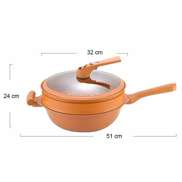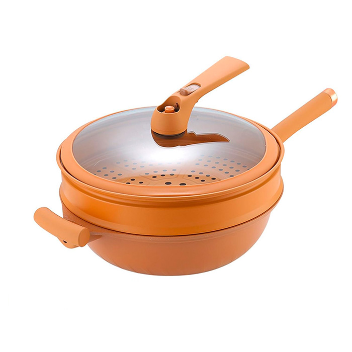 1x wok, 1x tvaicēšanas nodalījums, 1x vāks, 1x sūklis, 1x silikona lāpstiņa